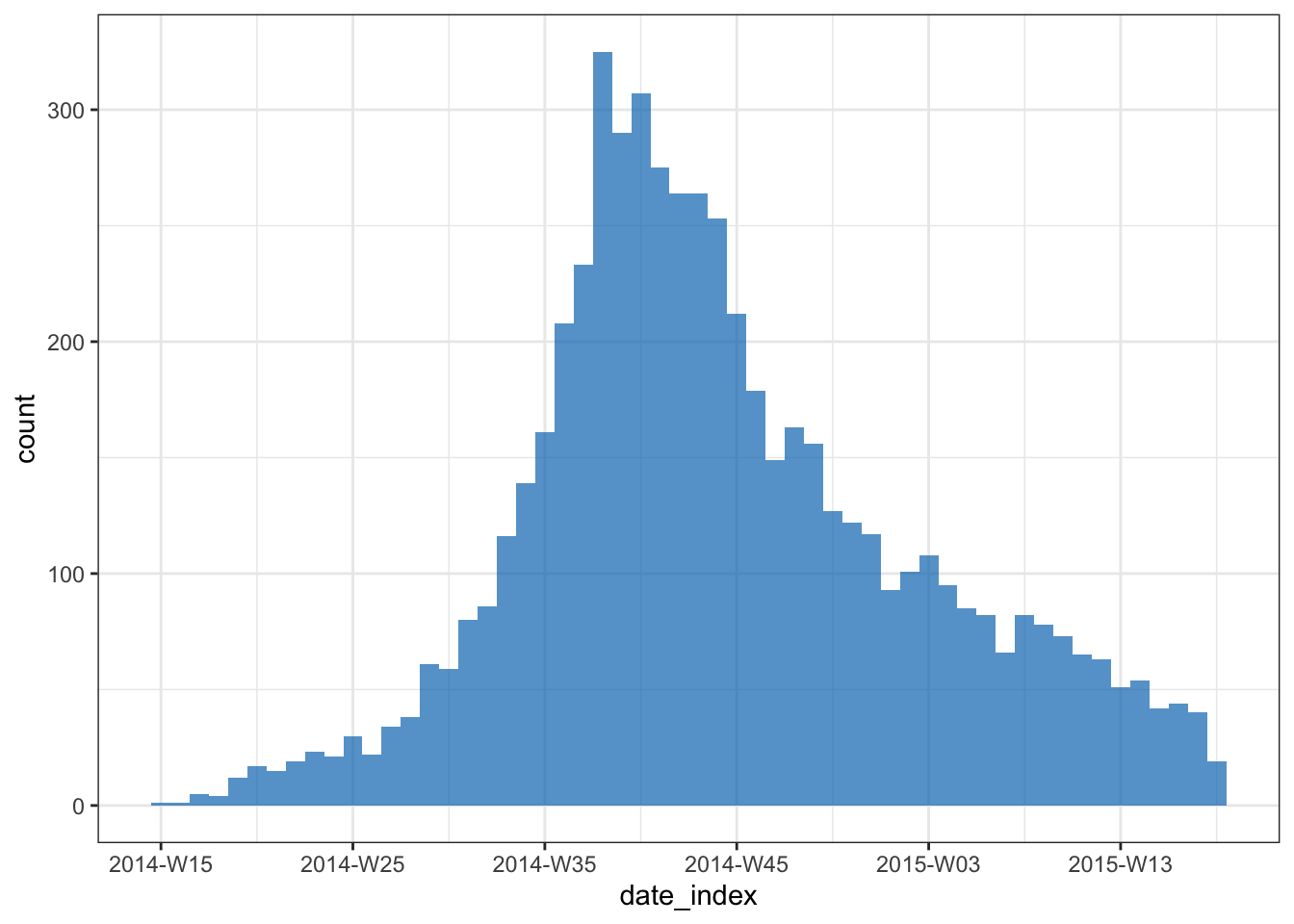 Calculate and plot the incidence again, this time using an interval of 1 week.